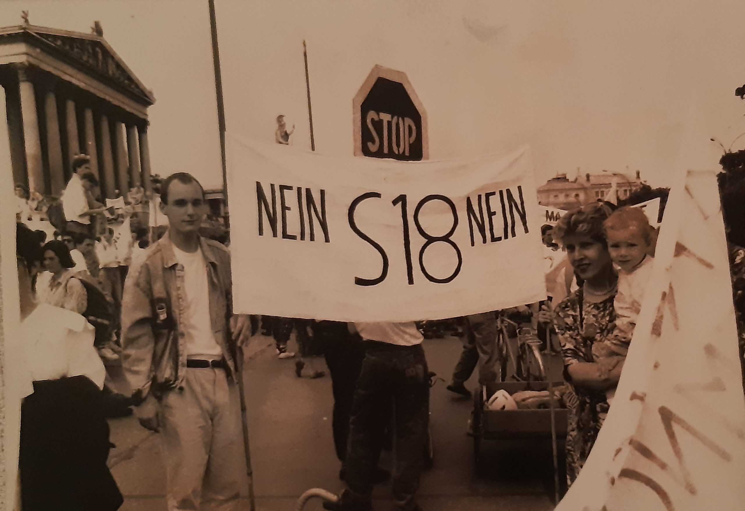 1990 nahm ich im zarten Alter von zwei Jahren an einem Protest gegen den Bau der Bodensee Schnellstraße S18 teil. Diese sollte die vorarlbergische Rheintalautobahn mit den schweizerischen Autobahnen A1 und A13 verbinden, wurde jedoch von Anrainern und Umweltschützern bekämpft. Die Kundgebung fand auf der Wiener Ringstraße statt und muss sehr familienfreundlich gewesen sein. Es gibt ein Foto, auf dem ich bequem in den Armen meiner Mutter hocke und mit skeptischem Blick – oder blendet mich die Sonne? – direkt in die Kamera schaue. Wer es geschossen hat, ist nicht mehr feststellbar, die Bildkomposition halte ich jedenfalls für sehr gelungen: Links das Parlament, rechts ein gesenktes Transparent, in der Mitte ein zweites mit der Aufschrift „NEIN S18 NEIN“ – gehalten von einem unbekannten Mann, der ein junger Ulrich Mühe sein könnte –, direkt darüber die papierene Nachempfindung eines klassischen Stopp-Schildes. Was soll ich sagen: Der Bau der S18 konnte vorerst verhindert werden. Ich war mit meinem Protest also erfolgreich. So begann meine Karriere als Outlaw.